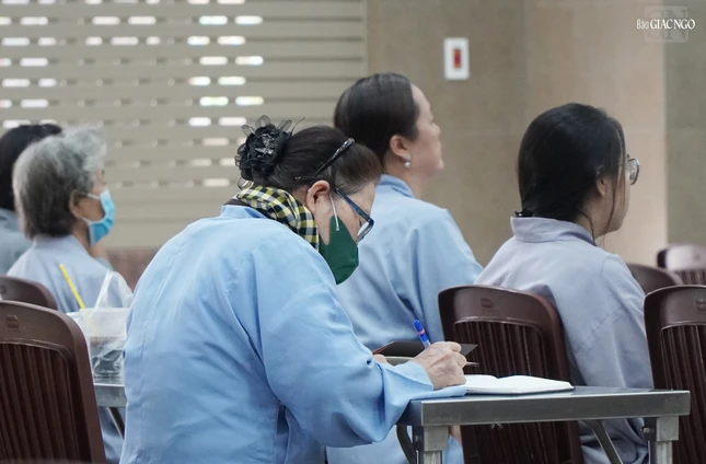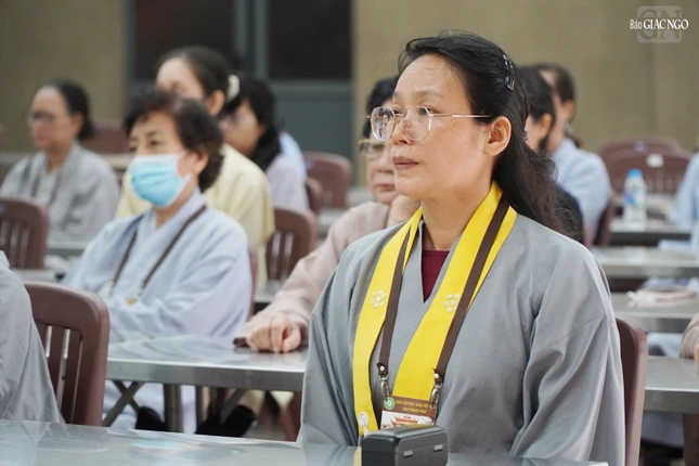 Các tình nguyện viên khóa tu lắng nghe pháp thoại |