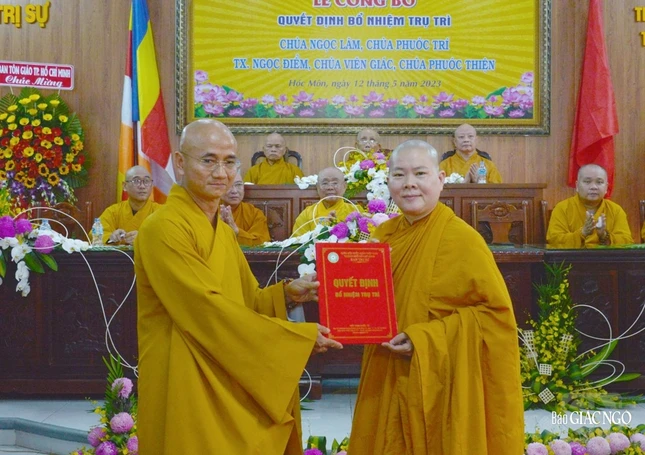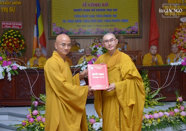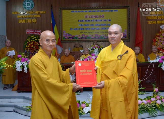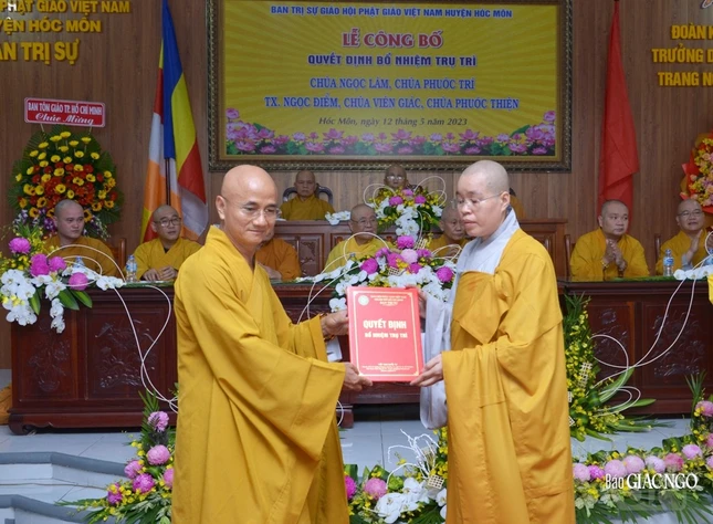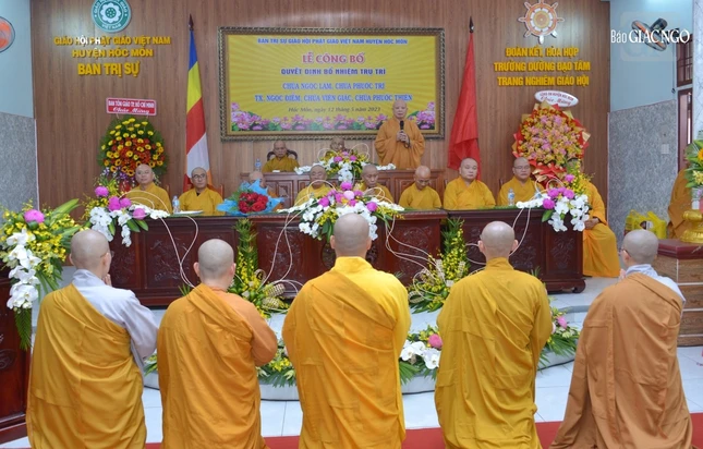 Đại đức Thích Trí Đức, Phó Thư ký Ban Trị sự GHPGVN TP đã công bố và điều hành phần trao quyết định đến chư Tăng Ni được bổ nhiệm trụ trì. Theo đó, Đại đức Thích Quảng Phước nhận quyết định bổ nhiệm trụ trì chùa Ngọc Lâm (xã Tân Thới Nhì); Đại đức Thích Quảng Thiện, trụ trì chùa Phước Trí (xã Tân Xuân); Ni sư Thích nữ Hiếu Liên, trụ trì tịnh xá Ngọc Điểm (xã Bà Điểm); Sư cô Thích nữ Hạnh Thể, trụ trì chùa Viên Giác (xã Bà Điểm); Sư cô Thích nữ Nguyên Bảo, trụ trì chùa Phước Thiện (xã Nhị Bình).