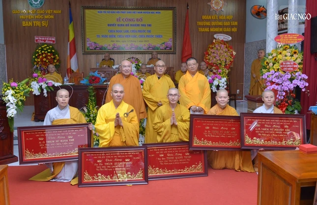 GNO - Sáng nay 12-5, tại chùa Giác Nguyên, Ban Trị sự GHPGVN H.Hóc Môn đã tổ chức lễ công bố, trao quyết định bổ nhiệm trụ trì các chùa Ngọc Lâm, Phước Trí, Viên Giác, Phước Thiện và tịnh xá Ngọc Điểm.