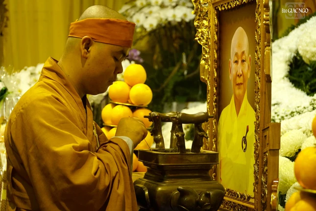 Tại buổi lễ, Thượng tọa Thích Giác Nguyên, pháp tử dâng lời tưởng niệm ân sư.