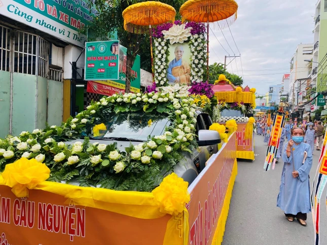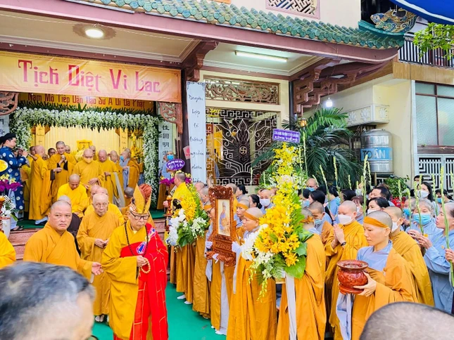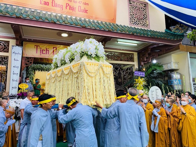 Ban Tổ chức lễ tang đã trang nghiêm cung thỉnh Trưởng lão Hòa thượng Thích Như Tín phất trần. Ban Nghi lễ thực hiện các nghi thức di quan đến nơi trà-tỳ trong tiếng đồng thanh niệm Phật của Tăng Ni, Phật tử.