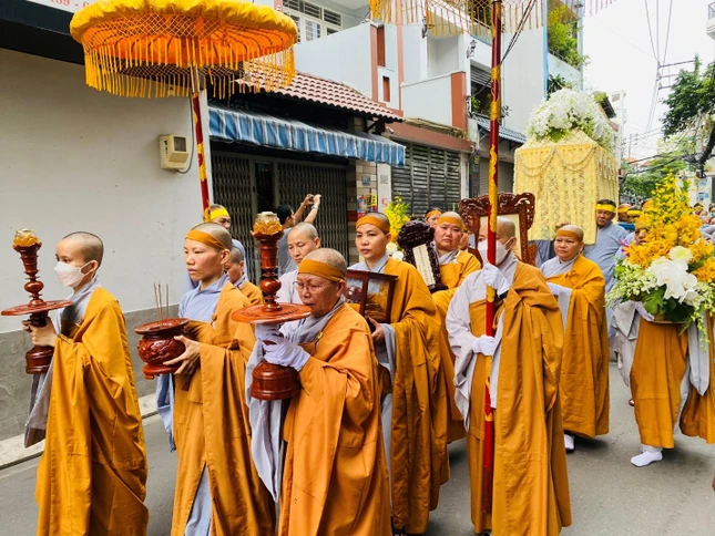 | Cung thỉnh y bát, long vị, di ảnh và kim quan cố Ni trưởng rời Giác linh đường |