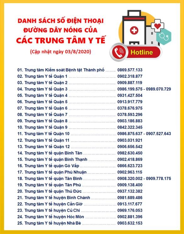 Riêng các trường hợp sinh sống tại TP.HCM, hãy gọi số điện thoại đường dây nóng của trung tâm y tế quận huyện nơi cư trú để khai báo, được hướng dẫn cách ly y tế và lấy mẫu xét nghiệm SARS-CoV-2.