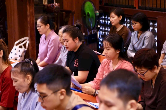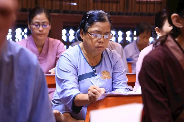| Phật tử lớn tuổi cẩn thận ghi chép, bạn trẻ chăm chú lắng nghe lời thầy giảng |
