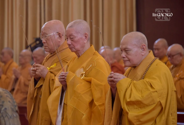 Trong giờ phút thiêng liêng với khói hương trầm quyện tỏa, Đức Pháp chủ cùng chư vị giáo phẩm Trưởng lão Hòa thượng Hội đồng Chứng minh thành kính dâng hương tưởng niệm, cúng dường Giác linh Bồ-tát Thích Quảng Đức, cùng chư Thánh tử đạo đã hy sinh cho đạo pháp trường tồn.