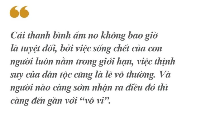 Chưa bước vào cửa vô vi thì còn có ta có người, có thắng có thua, có sang có hèn…, và không thể sống với nhau một cách thật bụng. Dĩ nhiên, cái thanh bình ấm no không bao giờ là tuyệt đối, bởi việc sống chết của con người luôn nằm trong giới hạn, việc thịnh suy của dân tộc cũng là lẽ vô thường. Và người nào càng sớm nhận ra điều đó thì càng đến gần với “vô vi”.