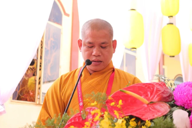 Đại đức Thích Thiện Đạo, Phó Chánh Văn phòng Ban Trị sự tỉnh báo cáo tiến trình tổ chức Đại giới đàn Nhựt Huệ Phật lịch 2568, các đàn giới được diễn ra thành tựu theo kế hoạch của Ban Tổ chức.