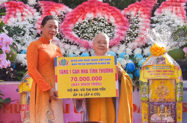Dịp này, Ban Trị sự GHPGVN H.Nhà Bè trao tặng căn nhà tình thương (trị giá 70 triệu đồng) và 200 phần quà đến các hộ gia đình khó khăn trên địa bàn.
