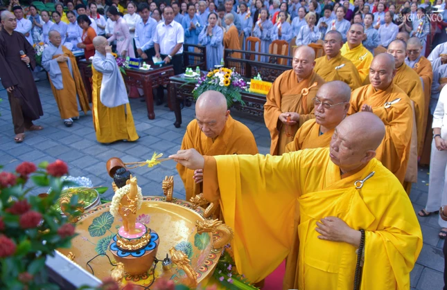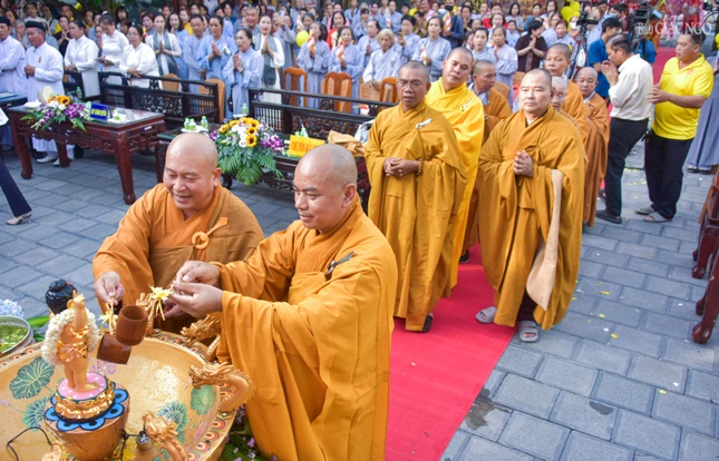 | Chư tôn đức thực hiện nghi thức Tắm Phật |