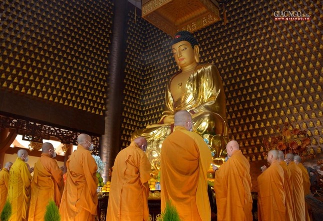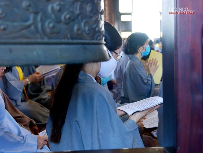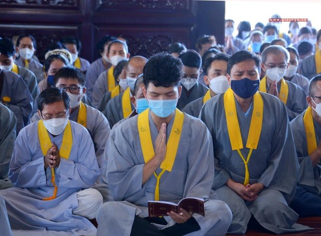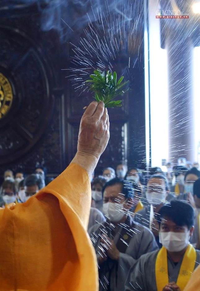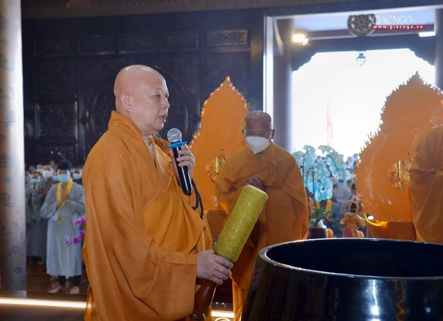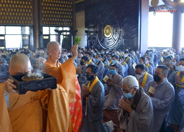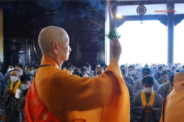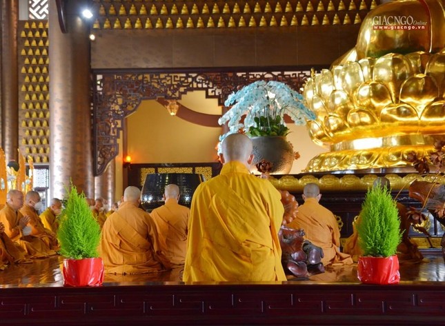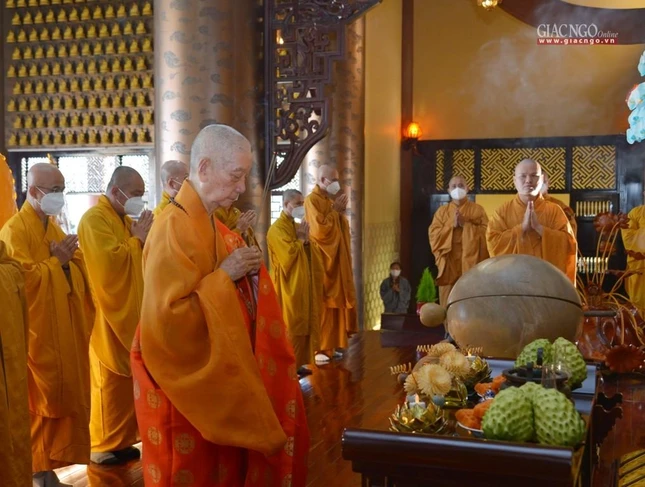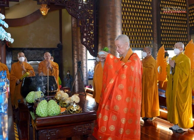 Tại chánh điện, Trưởng lão Hòa thượng Thích Trí Quảng đã niêm hương bạch Phật, cử hành nghi thức sái tịnh đàn tràng cùng sự tham dự của chư tôn đức Tăng Ni và đông đảo Phật tử.