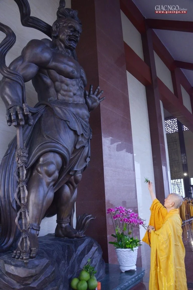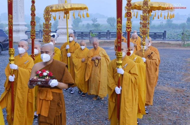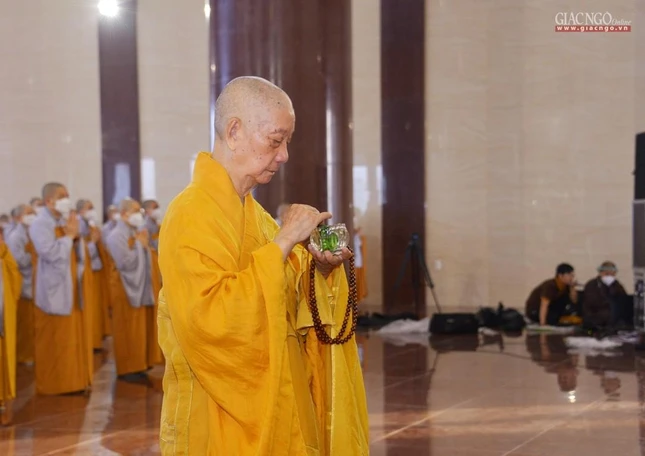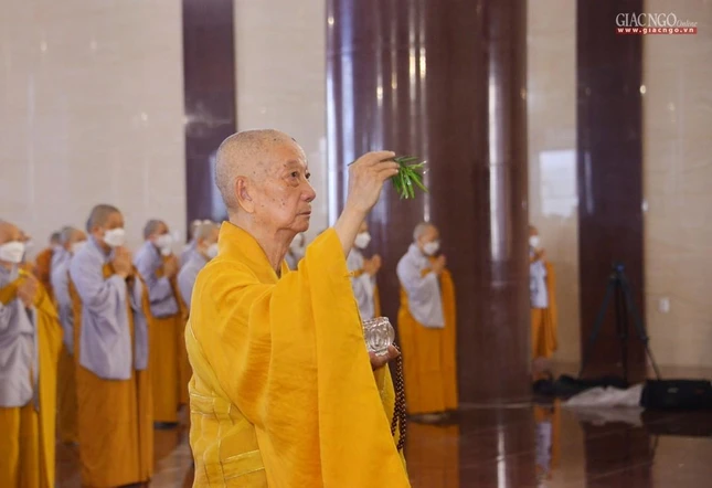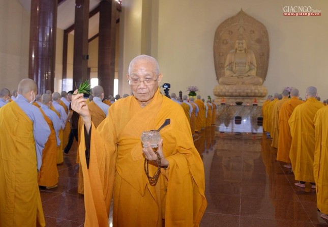 Trưởng lão Hòa thượng chứng minh và Hòa thượng Luật sư Thích Minh Thông đã sái tịnh khuôn viên, trong khi đại chúng nhất tâm đồng thanh trì tụng Đại bi, Thập chú.