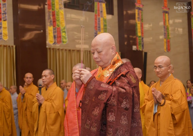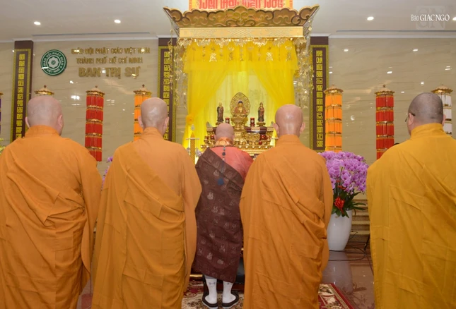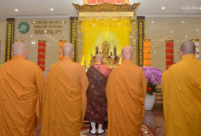 Hòa thượng Trưởng ban Trị sự GHPGVN TP.HCM cùng chư tôn đức niêm hương bạch Phật |