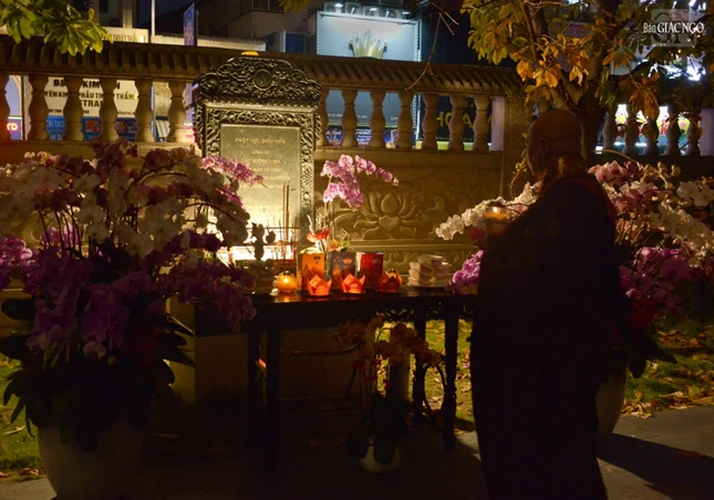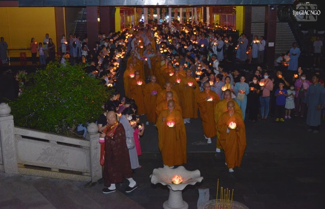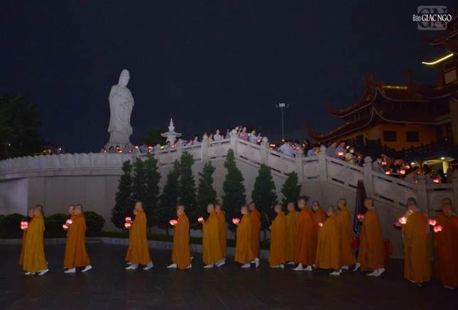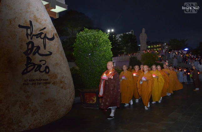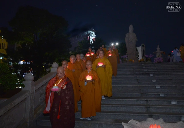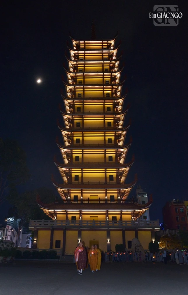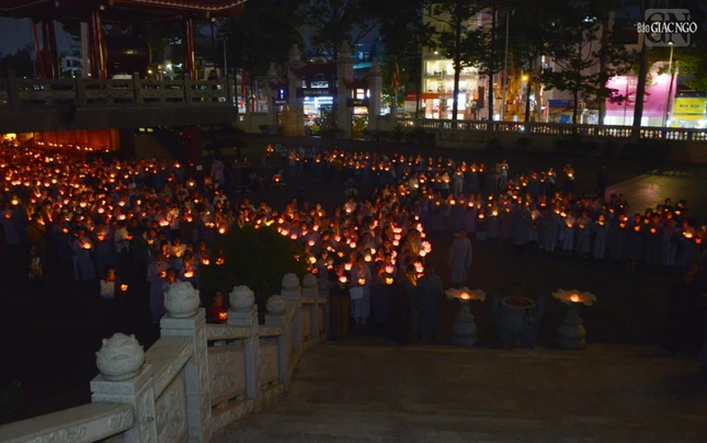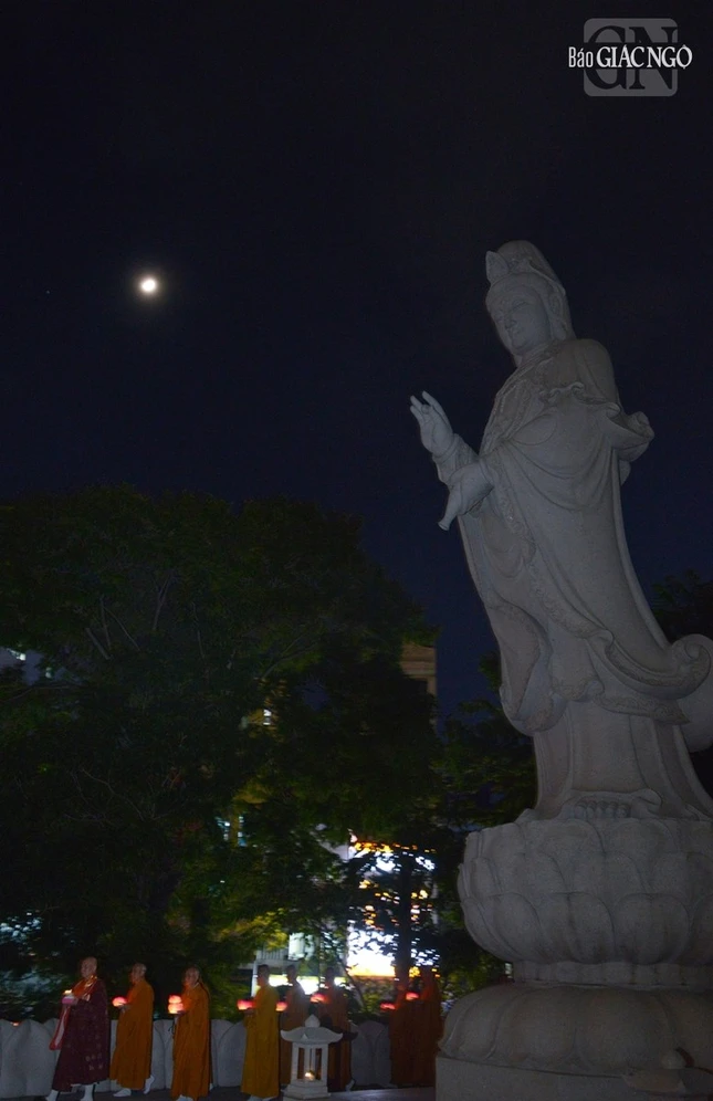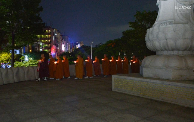 Trong tiếng niệm danh hiệu Bồ-tát Quán Thế Âm trầm hùng, Hòa thượng Trưởng ban Trị sự cùng chư tôn đức từ từ di chuyển thắp sáng đài Quán Thế Âm, bia tưởng niệm trong khuôn viên Việt Nam Quốc Tự, tháp Đa Bảo tại Việt Nam Quốc Tự và phóng liên đăng.
