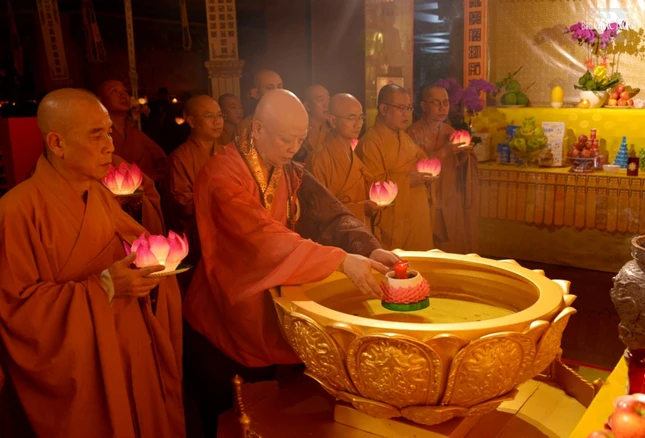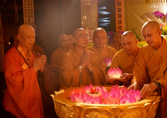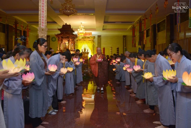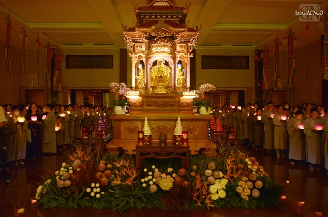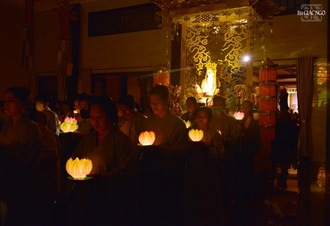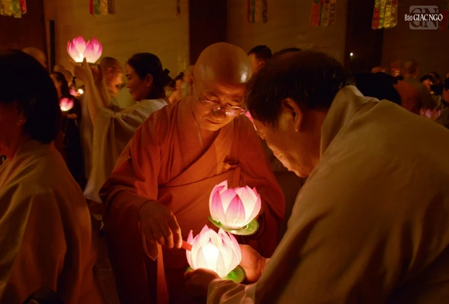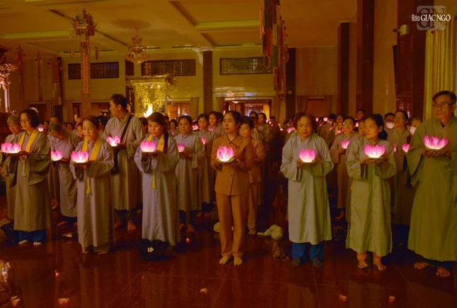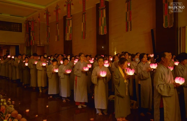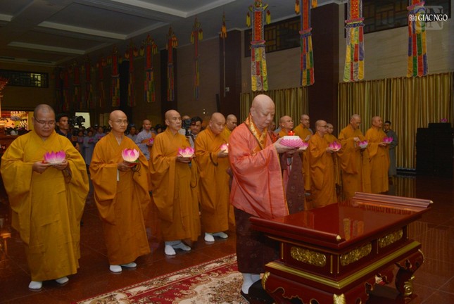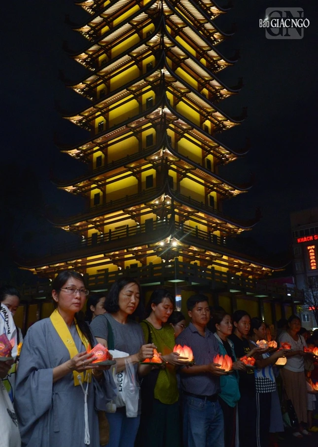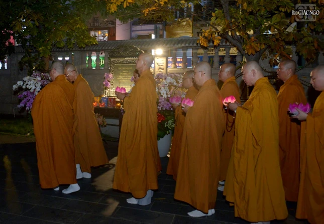 Trong tiếng niệm danh hiệu Bồ-tát Quán Thế Âm trầm hùng, Hòa thượng Trưởng ban Trị sự cùng chư tôn đức từ từ di chuyển thắp sáng đài Quán Thế Âm, bia tưởng niệm trong khuôn viên Việt Nam Quốc Tự, tháp Đa Bảo tại Việt Nam Quốc Tự và phóng liên đăng.