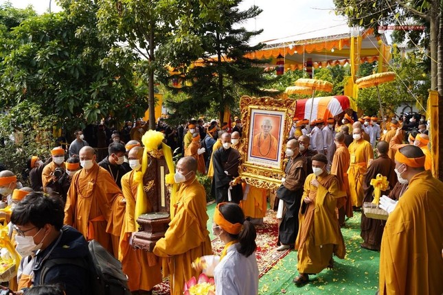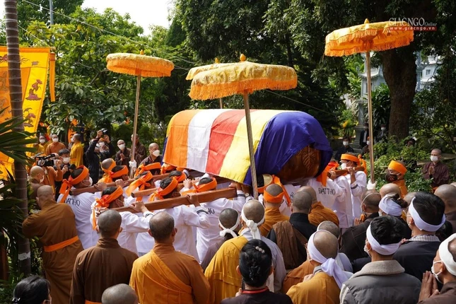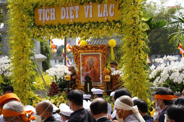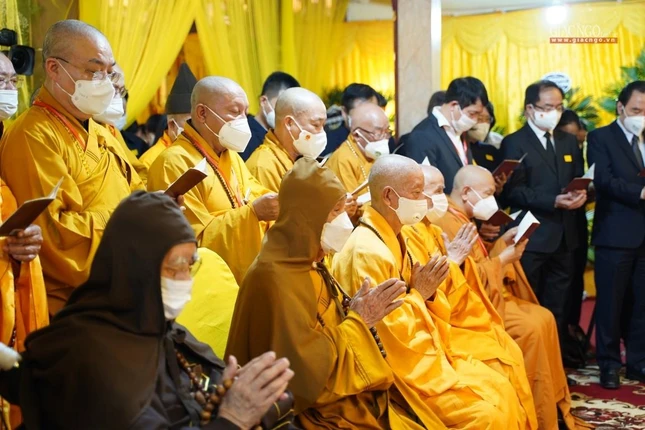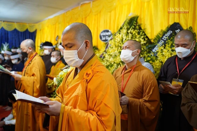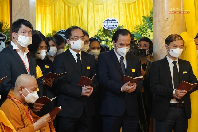 “Giờ đây, trong giây phút ngàn thu vĩnh biệt, trước linh đài hương trầm quyện tỏa, toàn thể Hội đồng Chứng minh, Hội đồng Trị sự, toàn thể Tăng, Ni và Phật tử chúng con xin thành kính thắp nén hương lòng cúng dường Giác linh Ngài. Kính nguyện Giác linh Đức Pháp chủ bất vong nguyện lực, tái hiện đàm hoa, phát triển đạo vàng, quang vinh họ Thích”, Trưởng lão Hòa thượng Đệ nhất Phó Pháp chủ kiêm Giám luật Hội đồng Chứng minh xúc động dâng lời tưởng niệm.