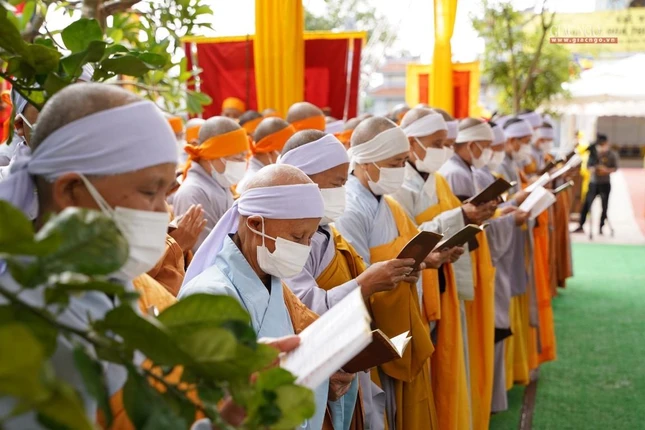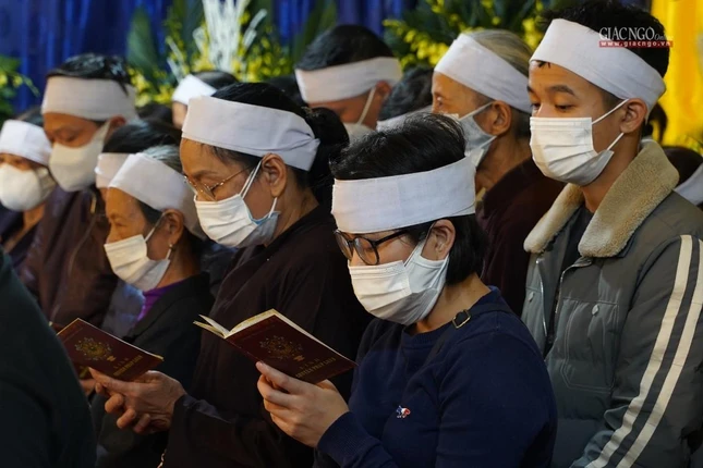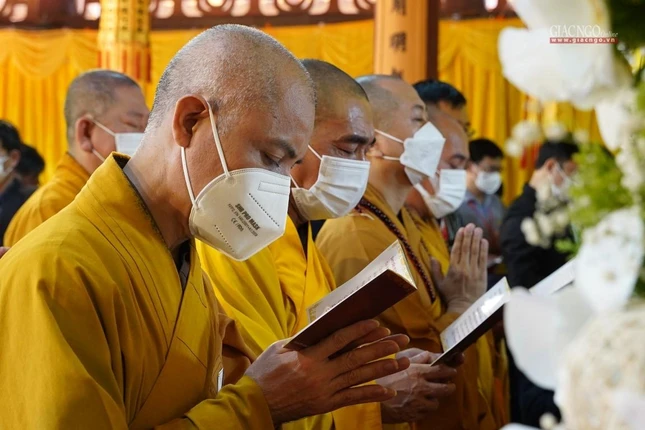 Tiếp đó, thể theo di huấn, toàn thể chư tôn giáo phẩm Hội đồng Chứng minh, Hội đồng Trị sự, Tăng Ni, Phật tử đã trì tụng thời kinh Chuyển Pháp luân cúng dường trước Giác linh đài Đức Pháp chủ GHPGVN, cầu nguyện thế giới hòa bình chúng sinh an lạc.