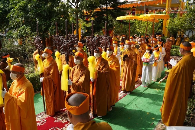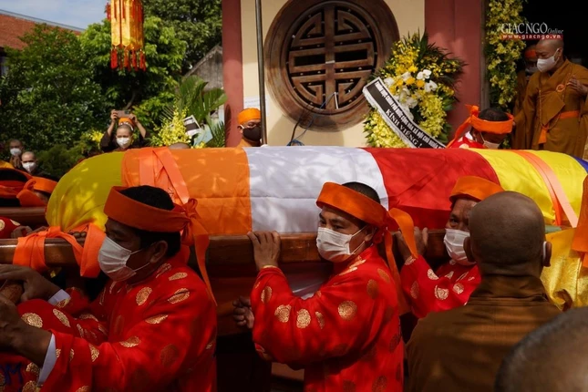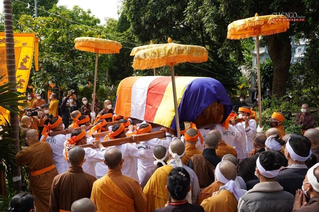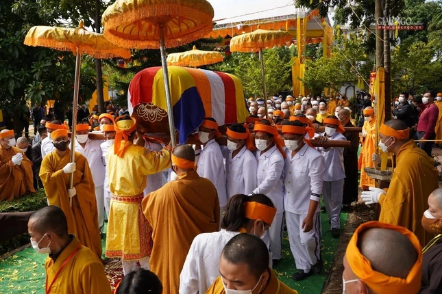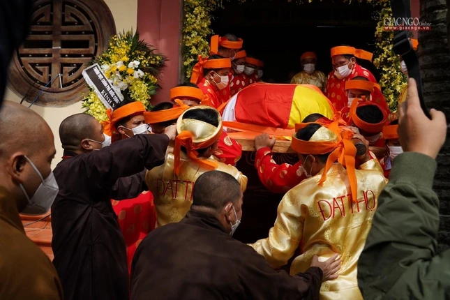 Ban Tổ chức lễ tang, môn đồ đệ tử cung thỉnh linh mô, bát hương, di ảnh, y bát rời Giác linh đường - cung thỉnh kim quan nhập bảo tháp trong khuôn viên tổ đình Viên Minh: