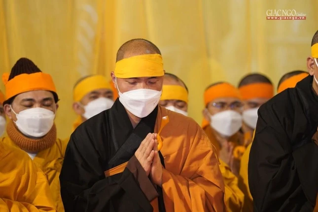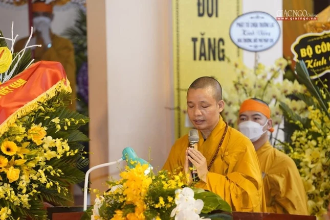 Cung kính tại lễ đường, Thượng tọa Thích Thọ Lạc, Ủy viên Thư ký Hội đồng Trị sự, Trưởng ban Trị sự GHPGVN tỉnh Ninh Bình, Phó ban Tổ chức lễ tang đọc lời cảm tạ.