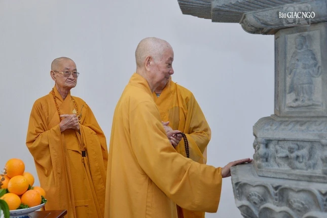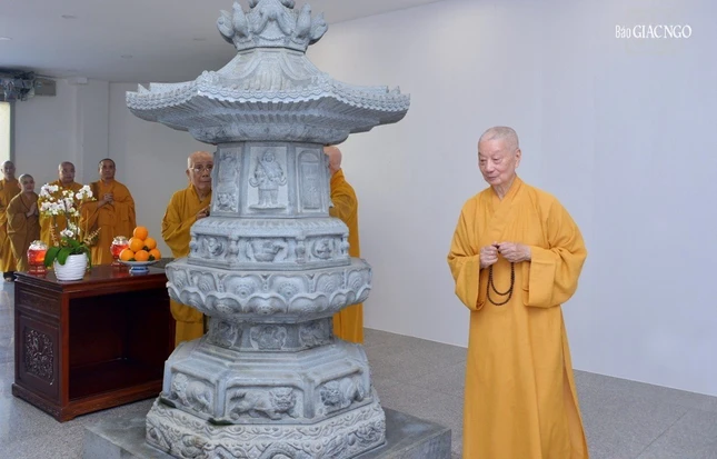 Đức Pháp chủ GHPGVN thăm bảo tháp lưu giữ linh cốt Đại lão Hòa thượng Thích Từ Nhơn nhân tưởng niệm 10 năm ngày ngài viên tịch - Ảnh: Bảo Toàn/BGN