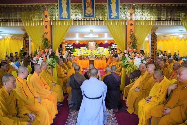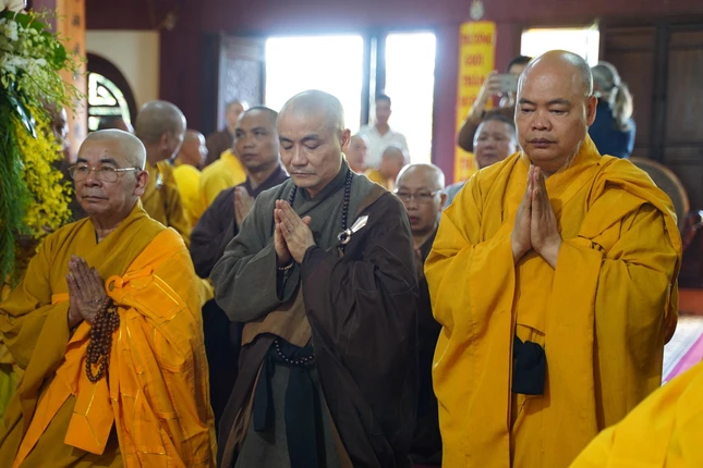 Chư tôn đức và quan khách trang nghiêm trong khi Trưởng lão Hòa thượng Quyền Pháp chủ cung tuyên lời tưởng niệm |