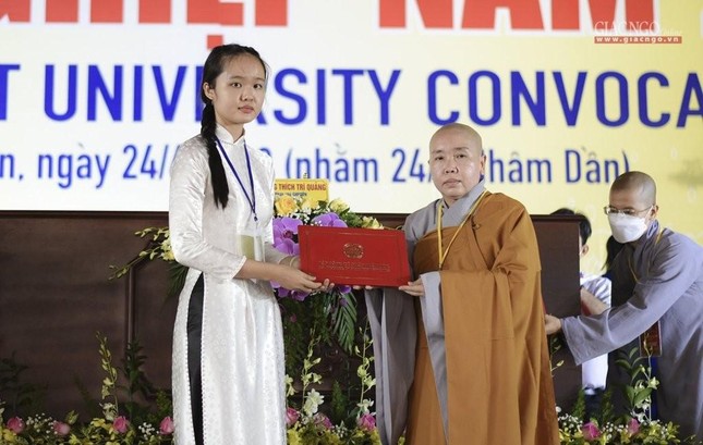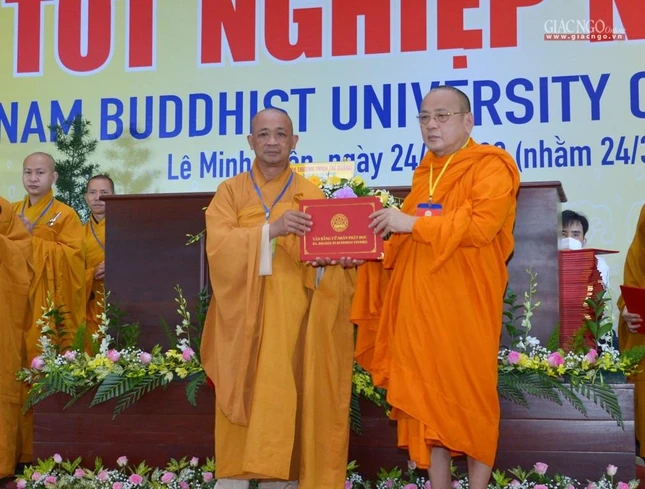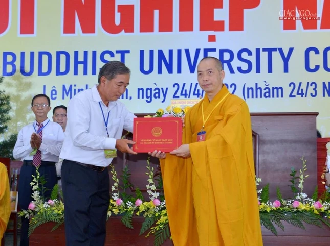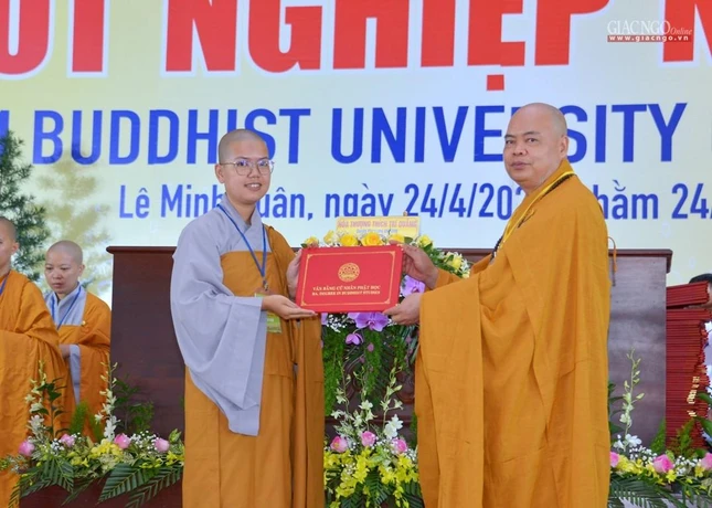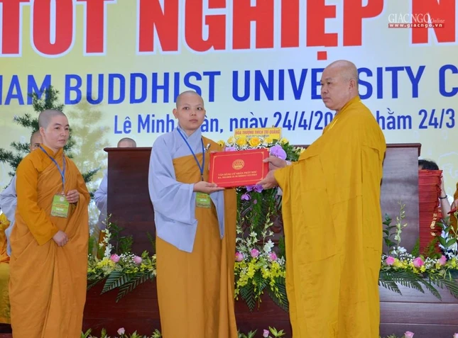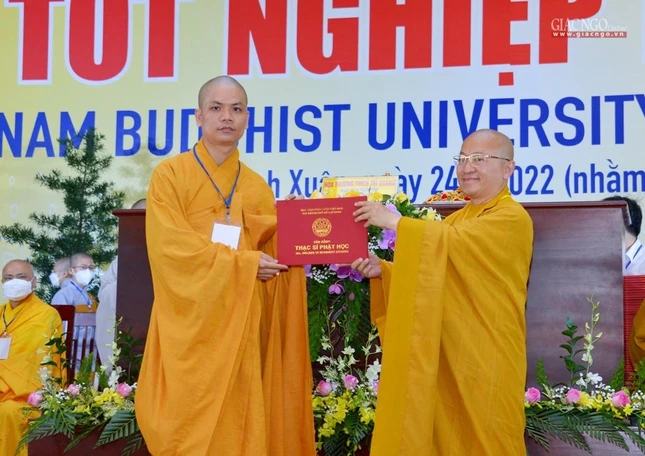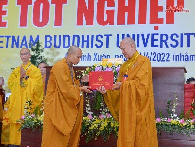 Trưởng lão Hòa thượng Viện trưởng trực tiếp phát thưởng và trao văn bằng tốt nghiệp đến các học viên thạc sĩ và các tân cử nhân thủ khoa. Sau đó, các vị Phó Viện trưởng đã luân phiên đại lao Trưởng lão Hòa thượng trao văn bằng đến các cử nhân chính quy và hệ đào tào từ xa và học viên cao đẳng tốt nghiệp trong đợt này.