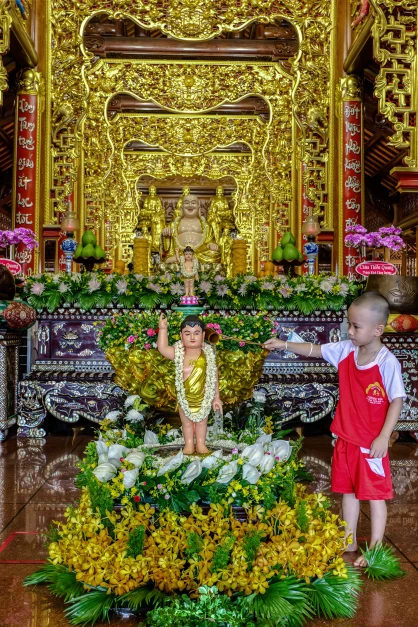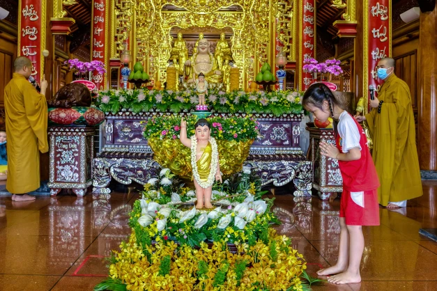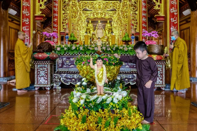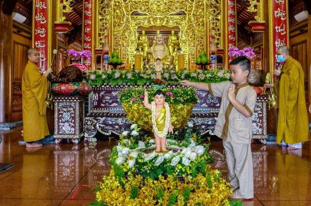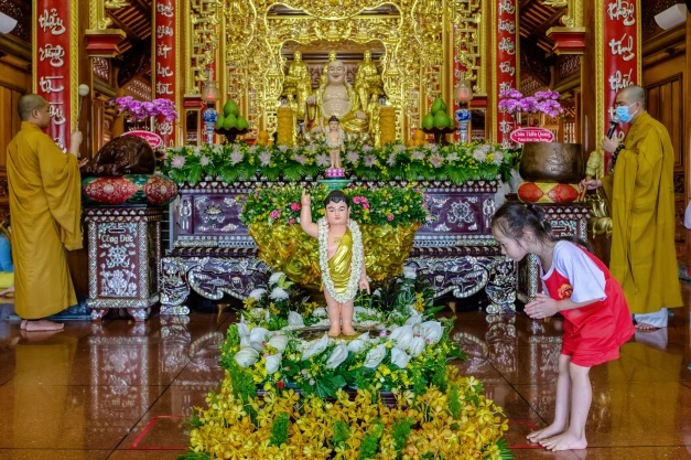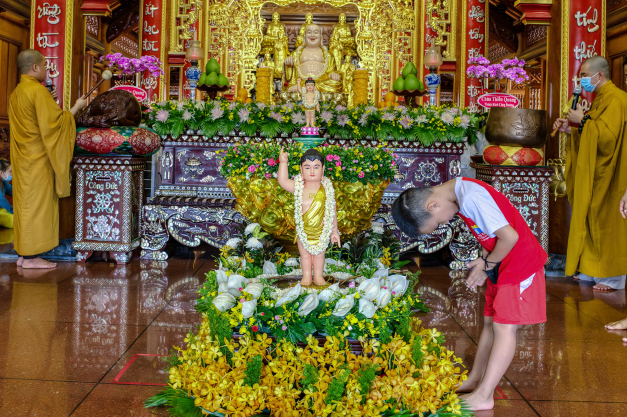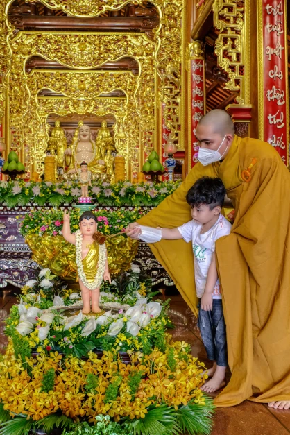 Thượng tọa trụ trì tu viện hướng dẫn các cháu nghi thức Tắm Phật |