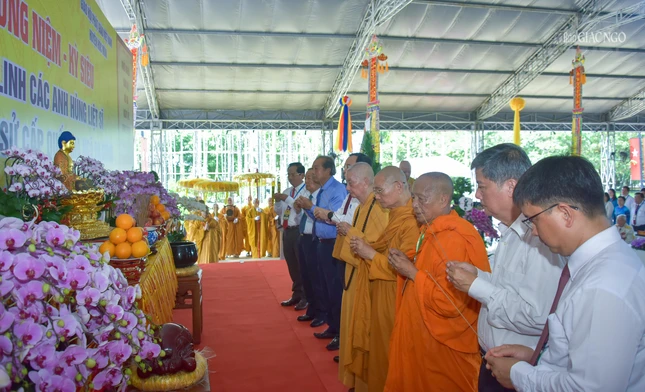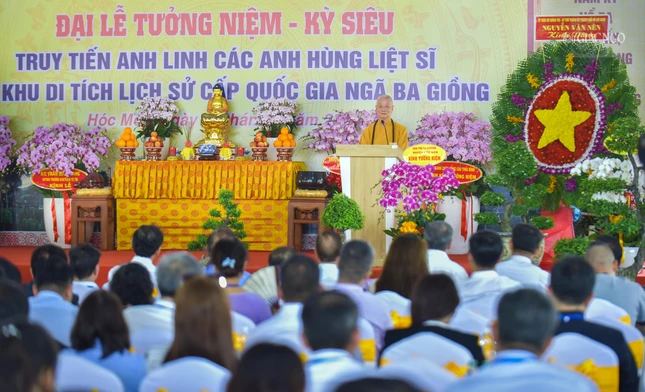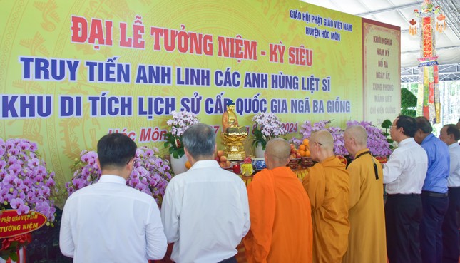 Sau đó, Đức Pháp chủ GHPGVN, chư tôn đức Tăng Ni cùng lãnh đạo Thành phố, H.Hóc Môn đã dâng hương tưởng niệm anh linh các anh hùng, liệt sĩ tại Đài tưởng niệm Ngã Ba Giồng.
