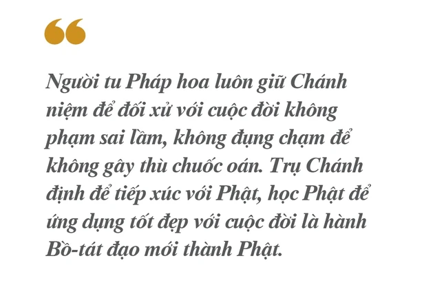 Người tu Pháp hoa luôn giữ Chánh niệm để đối xử với cuộc đời không phạm sai lầm, không đụng chạm để không gây thù chuốc oán. Trụ Chánh định để tiếp xúc với Phật, học Phật để ứng dụng tốt đẹp với cuộc đời là hành Bồ-tát đạo mới thành Phật.