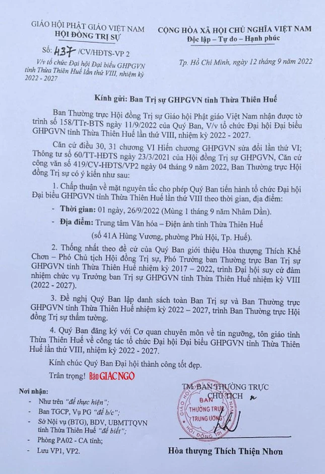 Theo đó, Trung ương GHPGVN chấp thuận về nguyên tắc cho phép tổ chức Đại hội đại biểu Phật giáo tỉnh Thừa Thiên Huế trong 1 ngày (26-9-2022, nhằm mùng 1-9-Nhâm Dần), tại Trung tâm Văn hóa - Điện ảnh tỉnh Thừa Thiên Huế (số 41A Hùng Vương, P.Phú Hội, TP.Huế).