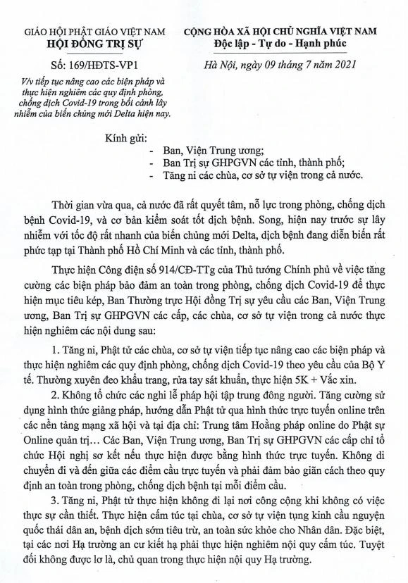 Công văn của Trung ương GHPGVN, ngày 9-7-2021 |
