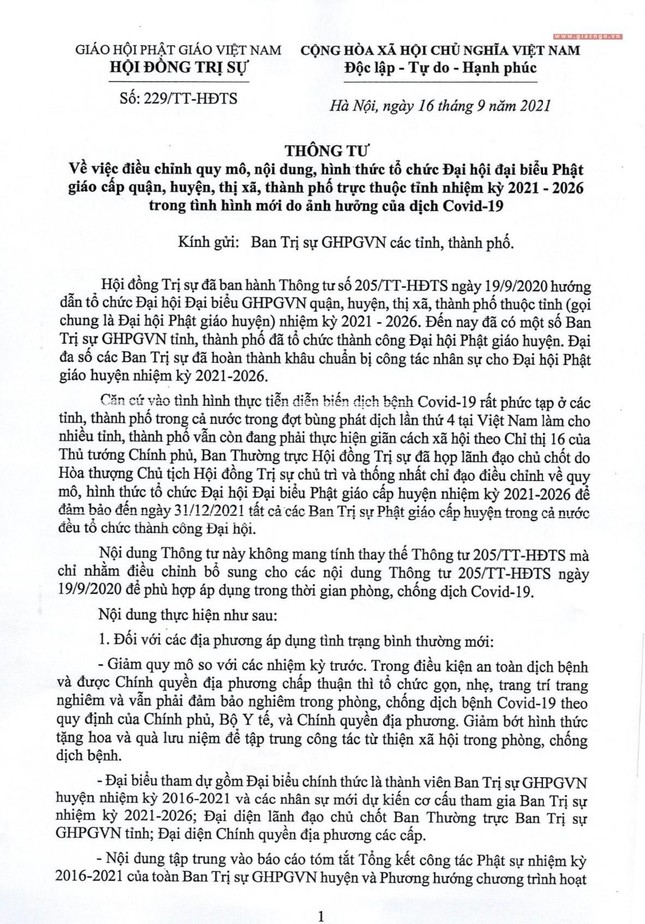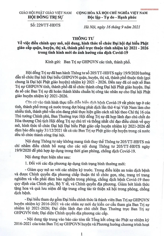 Theo đó, Hòa thượng Thích Thiện Nhơn, Chủ tịch Hội đồng Trị sự GHPGVN vừa ký Thông tư số 229/TT-HĐTS, ngày 16-9-2021, gửi đến Ban Trị sự GHPGVN các tỉnh, thành phố, về việc điều chỉnh quy mô, nội dung, hình thức tổ chức Đại hội đại biểu Phật giáo cấp quận, huyện, thị xã, thành phố trực thuộc tỉnh nhiệm kỳ 2021-2026 trong tình hình mới do ảnh hưởng của dịch Covid-19.