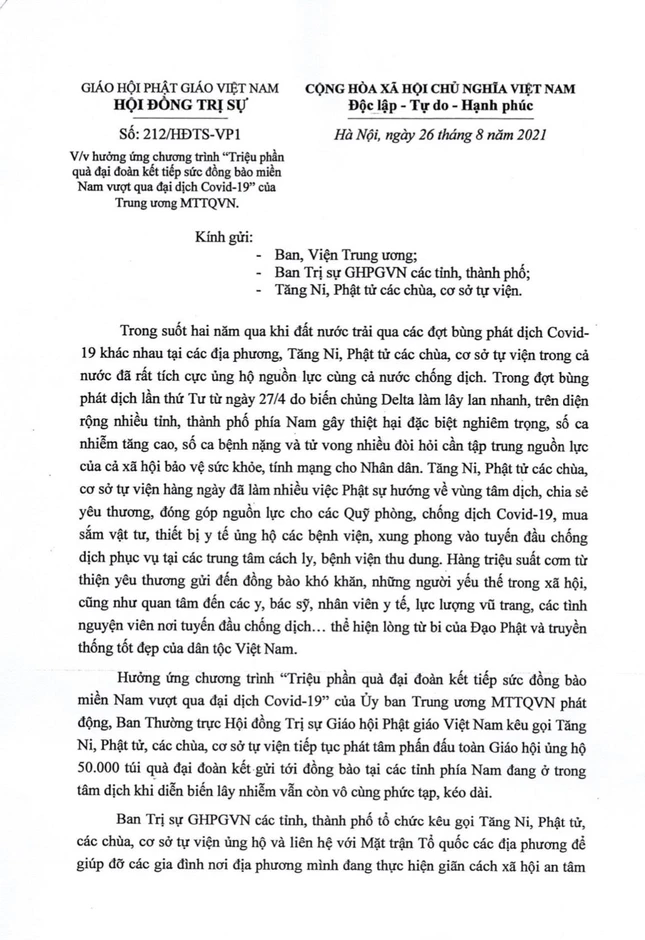 Theo đó, công văn nêu: Trong suốt hai năm qua khi đất nước trải qua các đợt bùng phát dịch Covid-19 khác nhau tại các địa phương, Tăng Ni, Phật tử các chùa, cơ sở tự viện trong cả nước đã rất tích cực ủng hộ nguồn lực cùng cả nước chống dịch. Trong đợt bùng phát dịch lần thứ tư từ ngày 27-4 do biến chủng Delta làm lây lan nhanh, trên diện rộng nhiều tỉnh, thành phố phía Nam gây thiệt hại đặc biệt nghiêm trọng, số ca nhiễm tăng cao, số ca bệnh nặng và tử vong nhiều đòi hỏi cần tập trung nguồn lực của cả xã hội bảo vệ sức khỏe, tính mạng cho nhân dân.