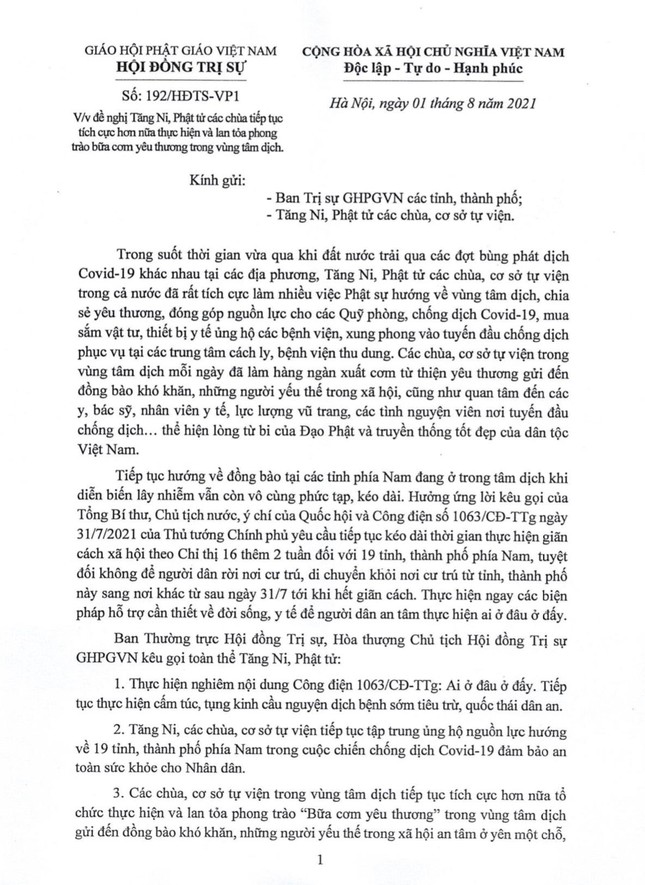 Theo đó, công văn do Hòa thượng Thích Thiện Nhơn, Chủ tịch Hội đồng Trị sự GHPGVN ấn ký gửi đến Ban Trị sự GHPGVN các tỉnh, thành phố; Tăng Ni, Phật tử các chùa, cơ sở tự viện, "đề nghị Tăng Ni, Phật tử các chùa tiếp tục tích cực hơn nữa thực hiện và lan tỏa phong trào bữa cơm yêu thương trong vùng tâm dịch".