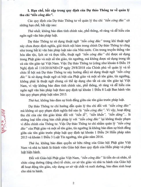 Thứ hai, không bảo đảm sự bình đẳng giữa các tôn giáo trước pháp luật. Dự thảo Thông tư chỉ hướng dẫn quản lý thu chi đối với “tiền công đức” mà không có quy phạm định nghĩa thế nào là “tiền công đức”. Vì vậy, hoạt động thu chi của các tôn giáo khác đối với “tiền lễ”, “tiền khấn”, “tiền dâng”... là những loại tiền cùng bản chất pháp lý với “tiền công đức” lại không thuộc phạm vi điều chỉnh của Thông tư. Việc Dự thảo Thông tư chỉ nhằm quản lý “tiền công đức” của Phật giáo và một số tôn giáo, tín ngưỡng là không bảo đảm sự bình đẳng giữa các tôn giáo trước pháp luật quy định tại khoản 1 Điều 24 Hiến pháp năm 2013 và khoản 1 Điều 3 Luật Tín ngưỡng, tôn giáo năm 2016.