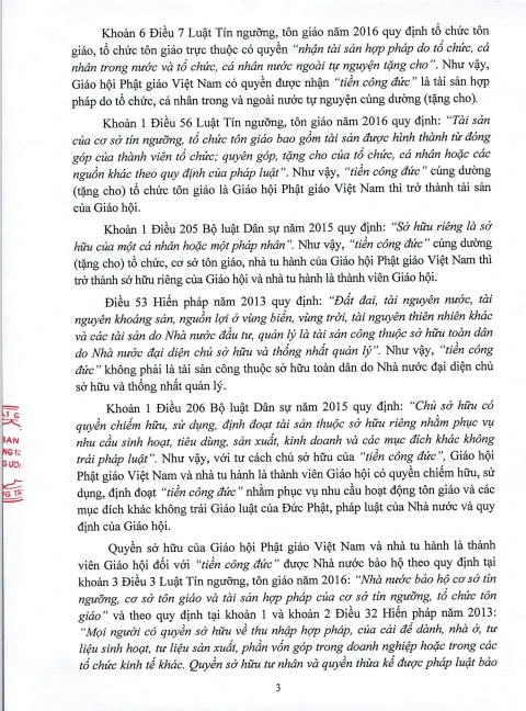 Quyền sở hữu của GHPGVN và nhà tu hành là thành viên Giáo hội đối với “tiền công đức” được Nhà nước bảo hộ theo quy định tại khoản 3 Điều 3 Luật Tín ngưỡng, tôn giáo năm 2016: “Nhà nước bảo hộ cơ sở tín ngưỡng, cơ sở tôn giáo và tài sản hợp pháp của cơ sở tín ngưỡng, tổ chức tôn giáo” và theo quy định tại khoản 1 và khoản 2 Điều 32 Hiến pháp năm 2013: “Mọi người có quyền sở hữu về thu nhập hợp pháp, của cải để dành, nhà ở, tư liệu sinh hoạt, tư liệu sản xuất, phần vốn góp trong doanh nghiệp hoặc trong các tổ chức kinh tế khác. Quyền sở hữu tư nhân và quyền thừa kế được pháp luật bảo hộ”. Như vậy, “tiền công đức” của Giáo hội Phật giáo Việt Nam và nhà tu hành là thành viên Giáo hội là bất khả xâm phạm.