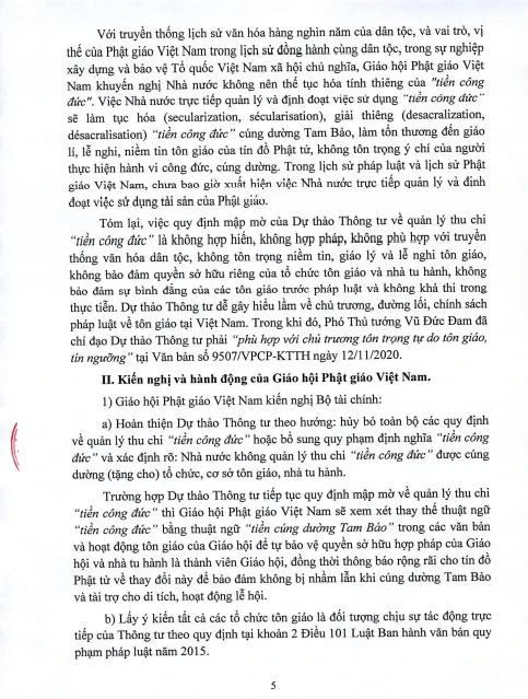 Tóm lại, việc quy định mập mờ của Dự thảo Thông tư về quản lý thu chi “tiền công đức” là không hợp hiến, không hợp pháp, không phù hợp với truyền thống văn hóa dân tộc, không tôn trọng niềm tin, giáo lý và lễ nghi tôn giáo, không bảo đảm quyền sở hữu riêng của tổ chức tôn giáo và nhà tu hành, không bảo đảm sự bình đẳng của các tôn giáo trước pháp luật và không khả thi trong thực tiễn. Dự thảo Thông tư dễ gây hiểu lầm về chủ trương, đường lối, chính sách pháp luật về tôn giáo tại Việt Nam. Trong khi đó, Phó Thủ tướng Vũ Đức Đam đã chỉ đạo Dự thảo Thông tư phải “phù hợp với chủ trương tôn trọng tự do tôn giáo, tín ngưỡng” tại Văn bản số 9507/VPCP-KTTH ngày 12-11-2020.