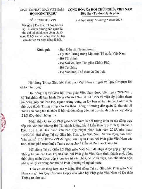 Theo đó, Hội đồng Trị sự Giáo hội Phật giáo Việt Nam được biết, ngày 28-4-2021, Bộ Tài chính đã ban hành Công văn số 4269/BTC-HCSN về việc lấy ý kiến tham gia đóng góp của các Bộ, ngành trung ương và Ủy ban Nhân dân các tỉnh, thành phố trực thuộc Trung ương vào Dự thảo Thông tư hướng dẫn quản lý, thu chi tài chính cho công tác tổ chức lễ hội và tiền công đức, tài trợ cho di tích và hoạt động lễ hội (Dự thảo Thông tư).