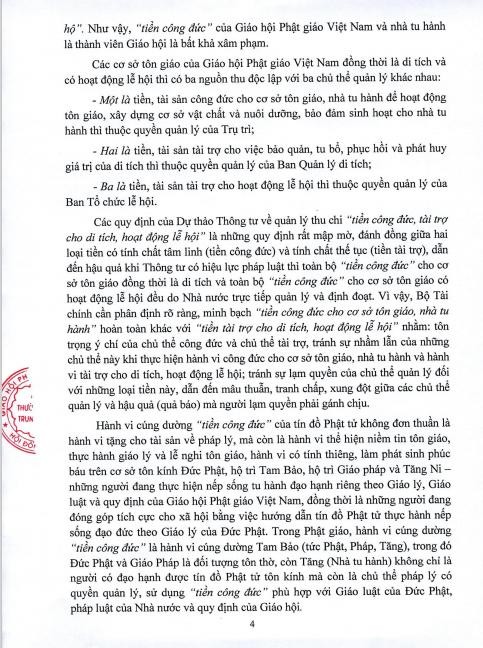 Trường hợp Dự thảo Thông tư tiếp tục quy định mập mờ về quản lý thu chi “tiền công đức” thì GHPGVN sẽ xem xét thay thế thuật ngữ “tiền công đức” bằng thuật ngữ “tiền cúng dường Tam bảo” trong các văn bản và hoạt động tôn giáo của Giáo hội để tự bảo vệ quyền sở hữu hợp pháp của Giáo hội và nhà tu hành là thành viên Giáo hội, đồng thời thông báo rộng rãi cho tín đồ Phật tử về thay đổi này để bảo đảm không bị nhầm lẫn khi cúng dường Tam bảo và tài trợ cho di tích, hoạt động lễ hội.