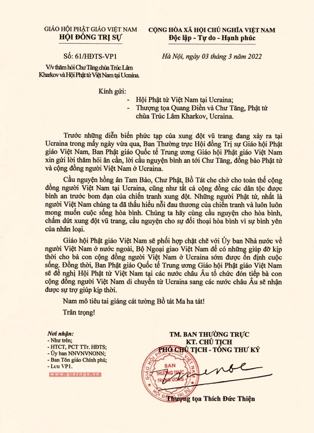 Theo đó, văn thư do Thượng tọa Thích Đức Thiện, Phó Chủ tịch kiêm Tổng Thư ký Hội đồng Trị sự, Trưởng ban Phật giáo Quốc tế Trung ương GHPGVN ký thay Hòa thượng Chủ tịch đã thăm hỏi chư Tăng và cầu nguyện bình an đến