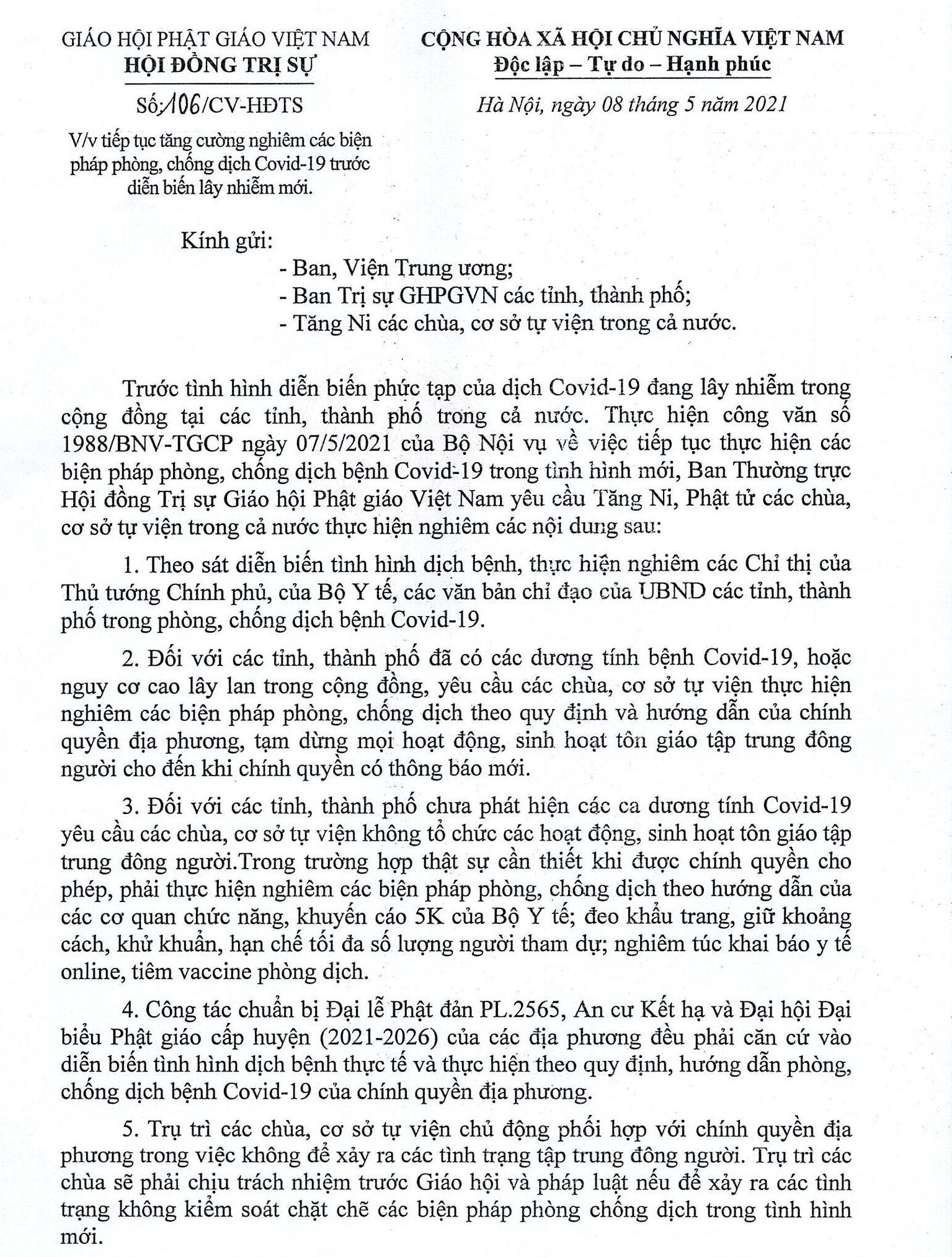 Theo đó, trước tình hình diễn biến phức tạp của dịch Covid-19 đang lây nhiễm trong cộng đồng tại các tỉnh, thành phố trong cả nước. Thực hiện công văn số 1988/BNV-TGCP ngày 7-5-2021 của Bộ Nội vụ về việc tiếp tục thực hiện các biện pháp phòng, chống dịch bệnh Covid-19 trong tình hình mới, Ban Thường trực Hội đồng Trị sự GHPGVN yêu cầu Tăng Ni, Phật tử các chùa, cơ sở tự viện trong cả nước thực hiện nghiêm các nội dung sau: