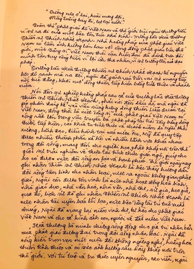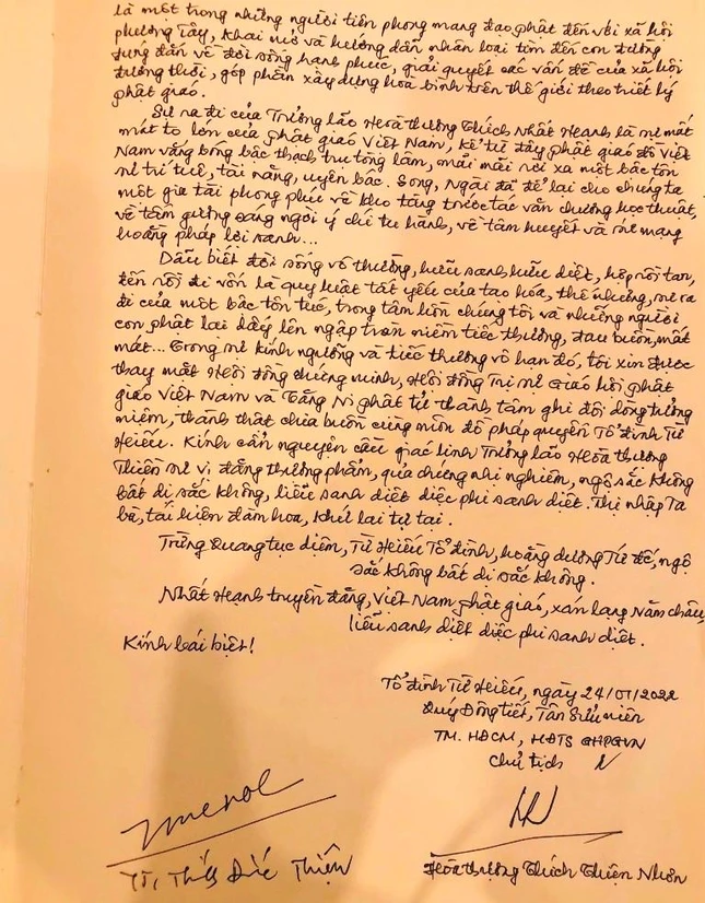 Hòa thượng Chủ tịch Hội đồng Trị sự đã ghi vào sổ tang lưu niệm, truy tán công hạnh hoằng truyền Phật giáo và trí tuệ của Thiền sư: “Toàn thể Phật giáo đồ Việt Nam và thế giới bùi ngùi thương tiếc vì sự ra đi của một bậc tôn túc khả kính - Trưởng lão Hòa thương Thích Nhất Hạnh. Nhà hoằng pháp của Phật giáo Việt Nam có tầm ảnh hưởng lớn lao với cộng đồng Phật giáo trên thế giới, một Tăng sĩ Phật giáo Việt Nam thời cận hiện đại đã dành trọn đời mình, tận tụy cống hiến vì lợi ích tha nhân, vì sự trường tồn của đạo pháp”.