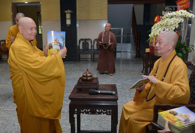 Đức Pháp chủ GHPGVN trao giai phẩm Giác Ngộ Xuân Ất Tỵ đến chư tôn đức |