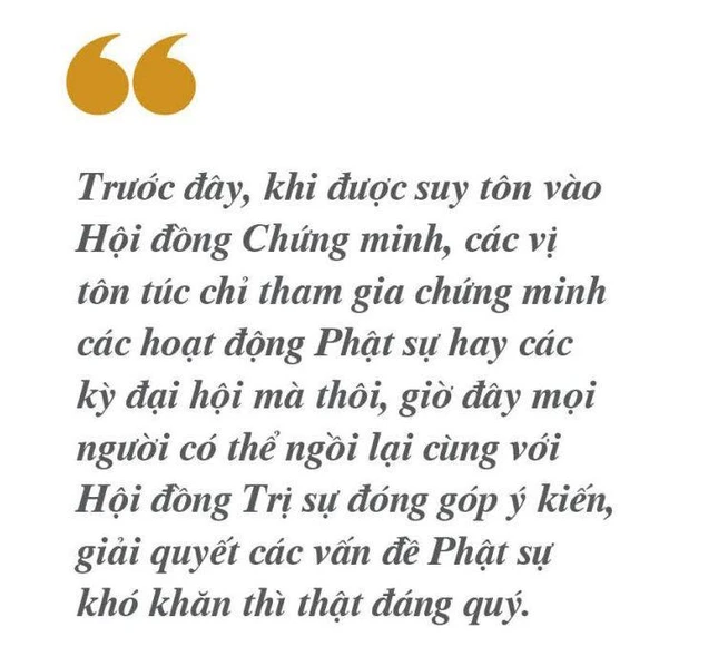 Bản thân tôi thấy rất hoan hỷ, xúc động, mặc dù mình đã có tuổi nhưng vẫn có cơ hội cống hiến tâm trí, sức lực để sát cánh với chư tôn túc trong Giáo hội chung lo các hoạt động Phật sự. Đây cũng là cái đà để chúng ta gắn kết lại với nhau để phát huy hết chức năng của Hội đồng Chứng minh cũng như thể hiện tâm tư, nguyện vọng của mình trong việc đồng hành, chia sẻ với Hội đồng Trị sự làm việc hiệu quả, ổn định hơn.