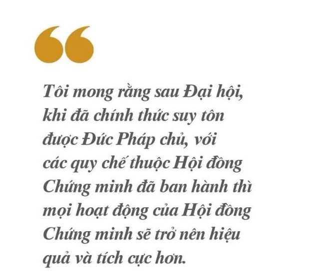 Vừa qua, để hoạt động của Hội đồng Chứng minh được tích cực hơn, quý Hòa thượng cùng chung lo, thảo luận để dự thảo và ban hành Quy chế hoạt động của Hội đồng Chứng minh GHPGVN để có quy củ và nề nếp hơn. Về vấn đề này, chúng tôi hết sức tích cực tán thành. Tôi mong rằng sau Đại hội, khi đã chính thức suy tôn được Đức Pháp chủ, với các quy chế thuộc Hội đồng Chứng minh đã ban hành thì mọi hoạt động của Hội đồng Chứng minh sẽ trở nên hiệu quả và tích cực hơn.