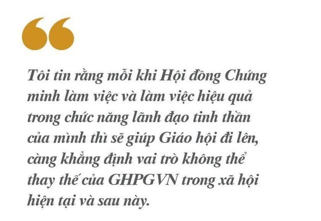 Với kinh nghiệm lịch sử từ các tổ chức Giáo hội trước đây, tôi tin rằng mỗi khi Hội đồng Chứng minh làm việc và làm việc hiệu quả trong chức năng lãnh đạo tinh thần của mình thì sẽ giúp Giáo hội đi lên, càng khẳng định vai trò không thể thay thế của GHPGVN trong xã hội hiện tại và sau này".