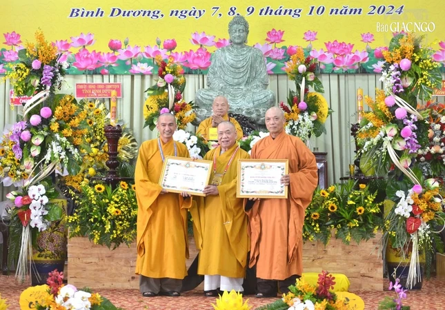 Dịp này, TƯGH và Ban Tăng sự T.Ư trao tặng Bằng tuyên dương công đức cho tập thể và cá nhân Ban Trị sự GHPGVN tỉnh Bình Dương đã phát tâm công đức toàn bộ chi phí cho khóa bồi dưỡng cũng như trao Chứng nhận tham dự khóa học đến đại biểu các tỉnh, thành.
