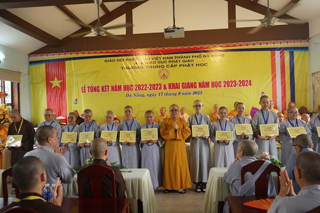 GNO - Sáng 17-9, tại chùa Phổ Đà (Q.Hải Châu, TP.Đà Nẵng), Ban Giám hiệu trường Trung cấp Phật học Đà Nẵng đã tổ chức lễ tổng kết năm học 2022-2023 và khai giảng năm học 2023-2024.