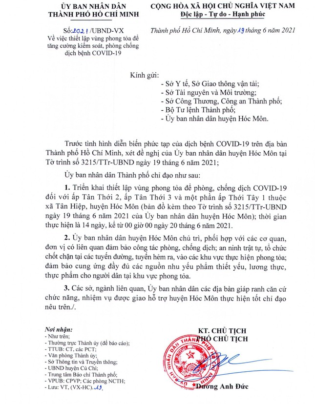 UBND huyện Hóc Môn chủ trì, phối hợp với các cơ quan, đơn vị có liên quan đảm bảo công tác phòng, chổng dịch; an ninh trật tự, tổ chức chốt chặn tại các tuyến đường, tuyến hẻm ra, vào các khu vực thực hiện phong tỏa; đảm bảo cung ứng đầy đủ các nguồn nhu yếu phẩm thiết yếu, lương thực, thực phẩm cho người dân tại khu vực phong tỏa.