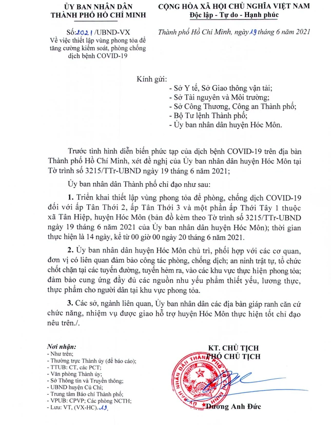 Theo đó, UBND TP.HCM quyết định triển khai thiết lập vùng phong tỏa để phòng, chống dịch Covid-19 đối với ấp Tân Thới 2, ấp Tân Thới 3 và một phần ấp Thới Tây 1 thuộc xã Tân Hiệp, huyện Hóc Môn trong vòng 14 ngày, kể từ 0 giờ ngày 20-6.