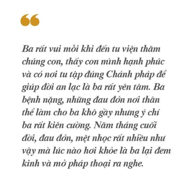 Ba lại rất thỏa lòng khi ba chị em con đi tu. Ba rất vui mỗi khi đến tu viện thăm chúng con, thấy con mình hạnh phúc và có nơi tu tập đúng Chánh pháp để giúp đời an lạc là ba rất yên tâm. Ba bệnh nặng, những đau đớn nơi thân thể làm cho ba khô gầy nhưng ý chí ba rất kiên cường. Năm tháng cuối đời, đau đớn, mệt nhọc rất nhiều như vậy mà lúc nào hơi khỏe là ba lại đem kinh và mở pháp thoại ra nghe.